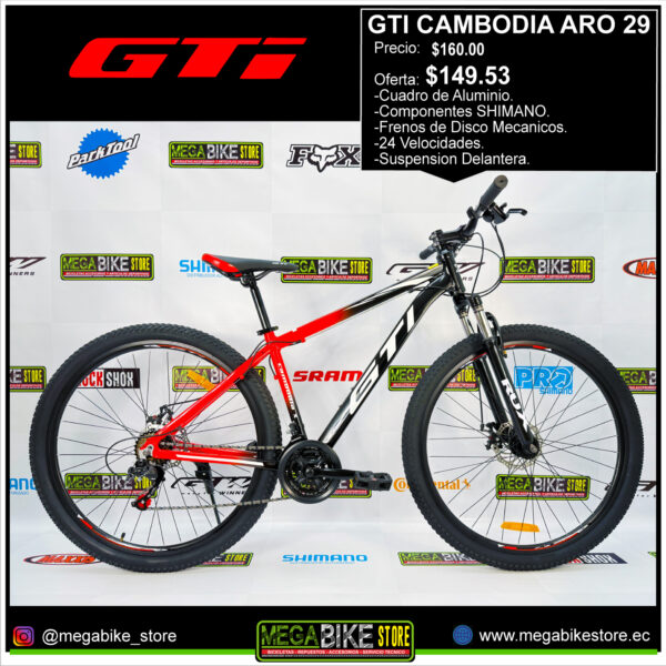 Bicicleta GTI CAMBODIA Aro 29 – Montañera – 7v- Aluminio – Frenos de Disco – Suspension Delantera (roja)